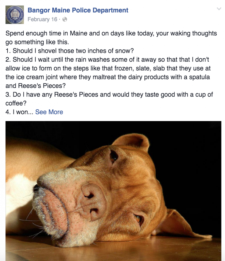 One of my favorite examples of this is the Bangor, Maine Police Department. Think about it: a police department needs to be a pretty serious place, right? But their social media guru has a lot of fun and engages their audience in a wonderful way. Here are a few examples of posts they put together: